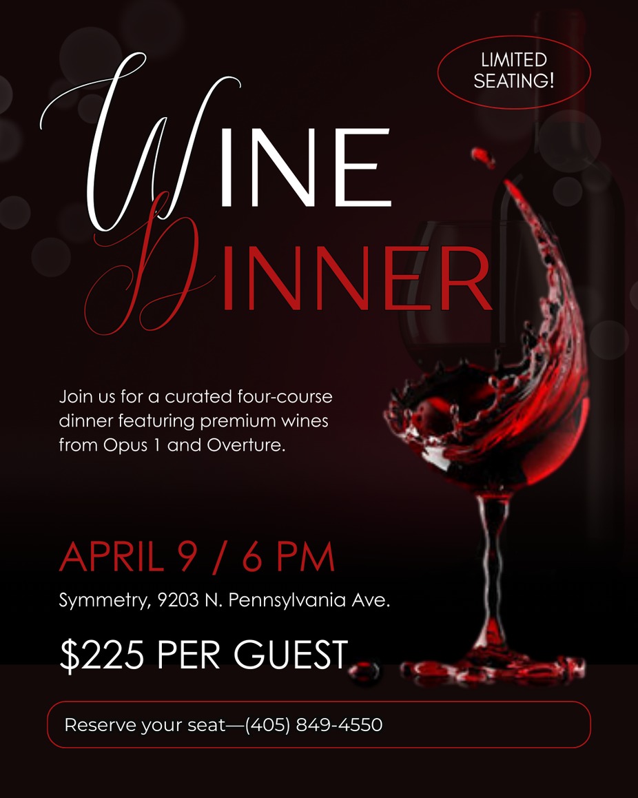 Wine down at Symmetry! All bottles of wine valued at $100 or less are 1/2 off every Wednesday from 4-9 p.m.